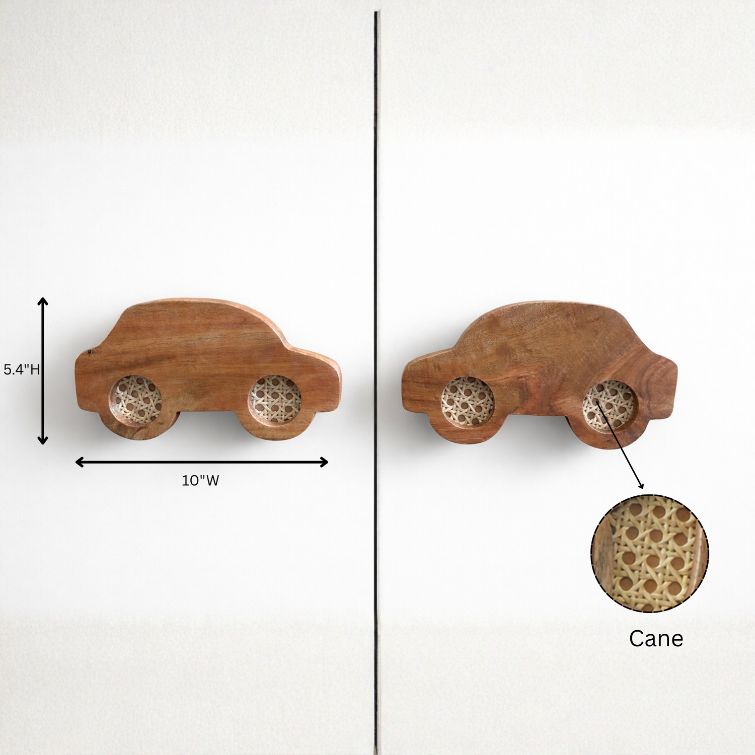 Drive some personality into your home decor with our Car Cane Cupboard Handles. These playful handles are meticulously handcrafted from natural wood, featuring a charming vintage car silhouette that adds a whimsical touch to any room. The design is uniquely accented with woven cane inserts in the wheels, blending classic wood textures with artisanal detail. Perfectly suited for a child's nursery, a playroom, or even a creative home office, these handles turn functional hardware into a conversational statement piece.