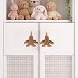 Take your decor to new heights with our Fighter Jet Wood & Cane Handles. These striking cabinet pulls are meticulously handcrafted from natural wood, featuring a sleek jet silhouette that brings a sense of adventure to any space. The wings are beautifully accented with natural woven cane inlays, offering a sophisticated texture that balances the playful design with an organic, boho-chic feel. Perfect for a pilot-in-the-making's nursery or a creative home office, these handles are a unique way to personalize wardrobes and dressers.