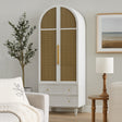 Introducing the exquisite Cane Arch Wardrobe with Drawers, a stylish and functional storage solution designed to elevate any living space. This piece boasts an elegant arched silhouette, beautifully complemented by natural woven cane panels on its upper doors. Crafted from a combination of wood, MDF, ply, and veneer, it ensures durability and a refined finish. Measuring 70" H x 26" W x 30" D, it offers ample storage with a versatile wardrobe section above and three spacious drawers below, perfect for organizing clothing, linens, or personal items. The light wood tone and minimalist hardware create a serene aesthetic, blending seamlessly with bohemian, coastal, or modern farmhouse decor. This wardrobe is a testament to sophisticated design and practical utility.
