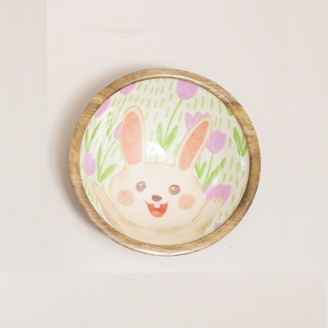 This is a 9" x 9" round wooden bowl distinguished by its cheerful, whimsical design. The primary feature is the hand-painted interior, which showcases a blushing, light-colored bunny with long, pink ears and a wide, happy smile.