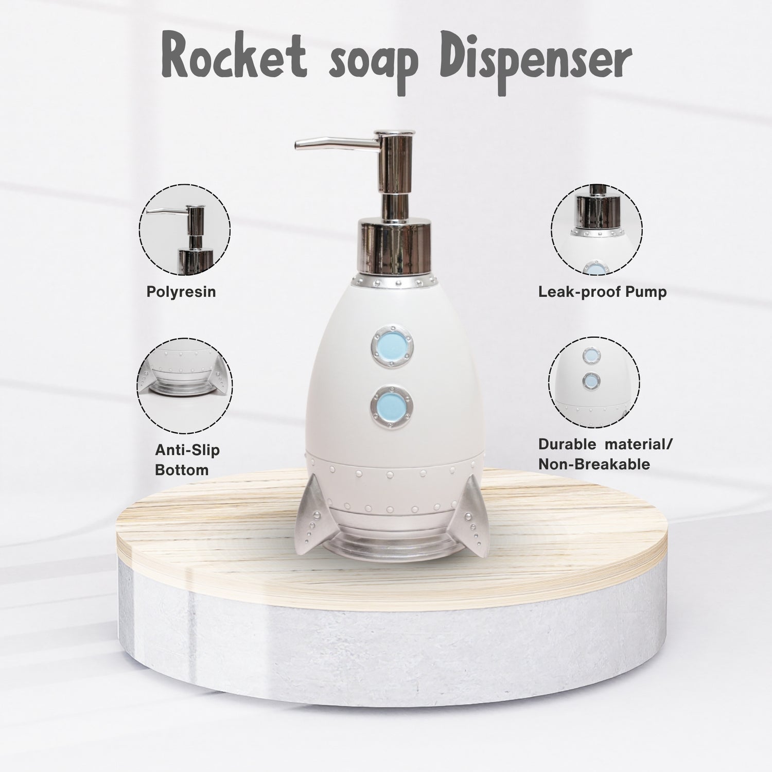 The Rocket Soap Dispenser is a fun and functional bathroom accessory, perfect for adding a playful touch to kids' spaces or anyone who loves unique decor. Made from durable polyresin, this dispenser features a charming rocket design with a leak-proof pump for hassle-free soap dispensing. The anti-slip bottom ensures it stays securely in place, while the non-breakable material provides long-lasting durability. With a wide refillable opening, it’s easy to top up with your favorite liquid soap or lotion. Ideal for brightening up your bathroom or kitchen, this quirky dispenser combines practicality with a touch of whimsy.