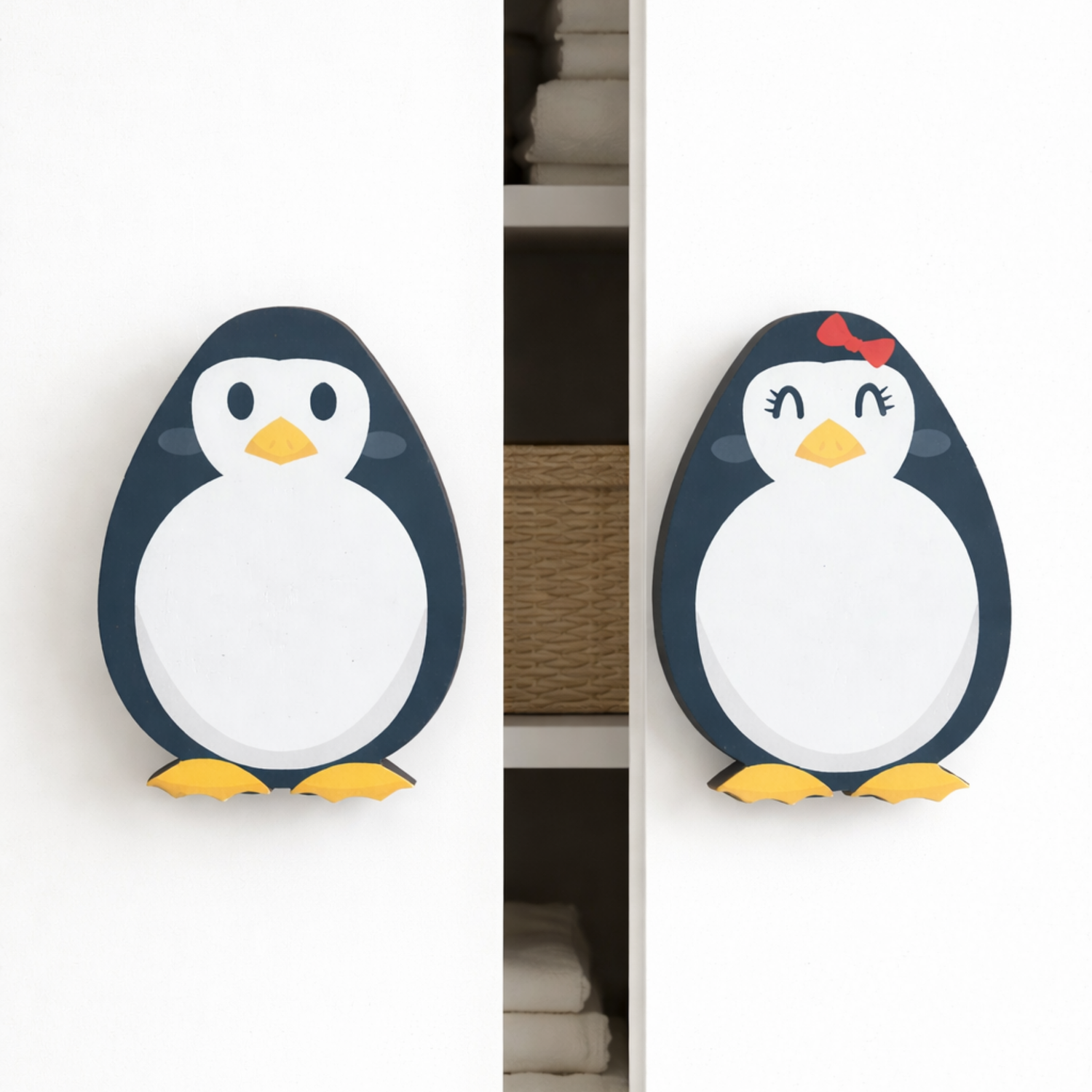 Add a touch of arctic wonder to your child’s nursery or bedroom with our Penguin Handle set. This delightful duo features two charming penguin characters, one adorned with a sweet red bow, designed to face each other for a coordinated "couple" look on double doors or adjacent drawers. Expertly crafted from high-quality solid wood with a rich natural grain on the reverse, these handles are built for both beauty and durability. The smooth, rounded egg-shaped design is perfectly sized for little hands to grip, turning everyday furniture into a playful centerpiece for any winter-themed or animal-inspired room.