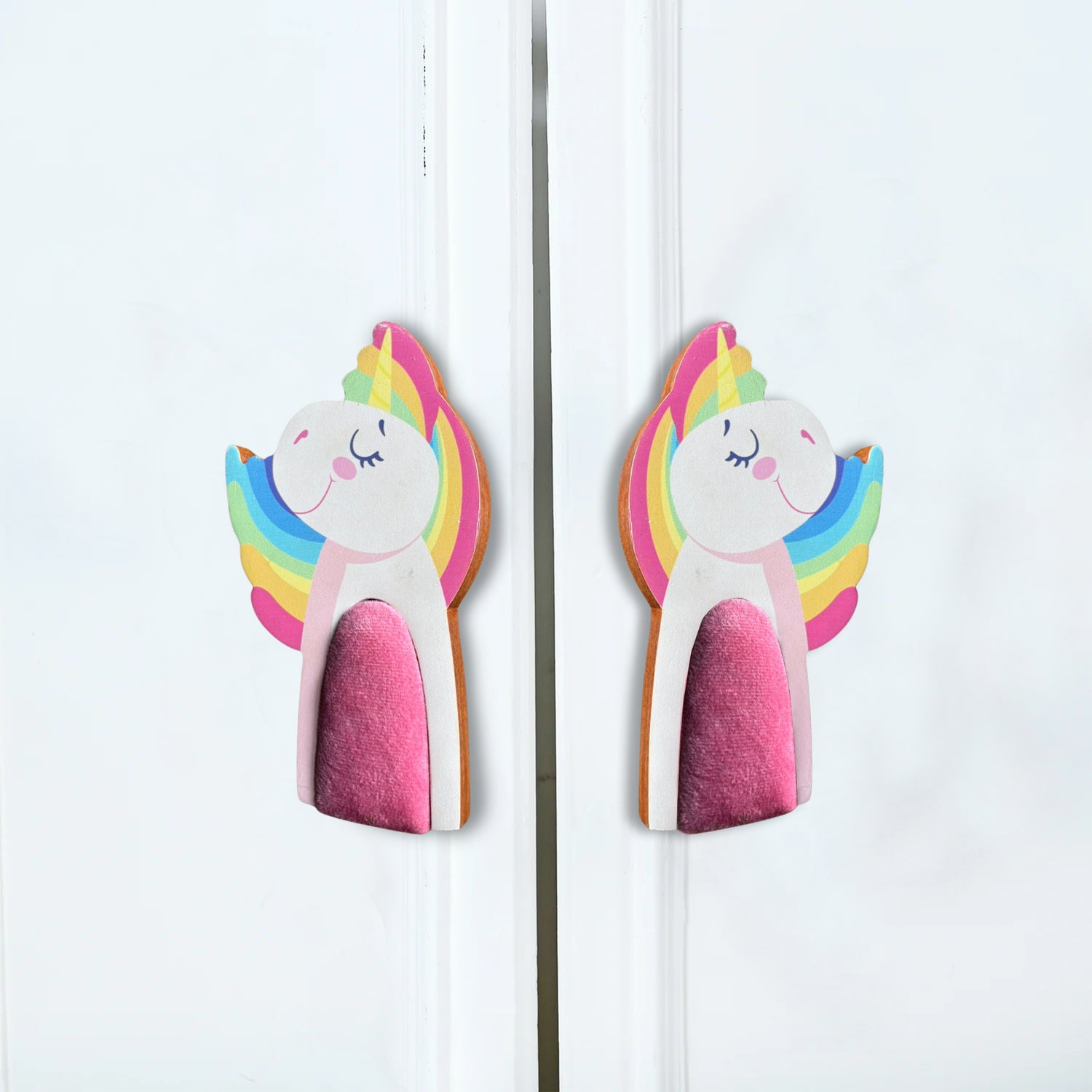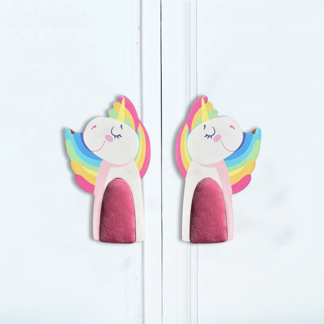 This is a set of two handcrafted cupboard or drawer handles shaped like unicorns. Designed for a child's room or nursery, they feature a whimsical, cartoon-style unicorn with a white body, a light pink head, and a rainbow-colored horn and wings in pastel shades of pink, yellow, and blue. The most distinctive feature is the central section of the unicorn's body, which is a soft, textured pink fabric. This fabric element adds a unique, plush, and tactile feel to the handles, making them more appealing for little hands. The handles are designed to be a pair, with one unicorn facing left and the other facing right, perfect for adorning a pair of cabinet doors.