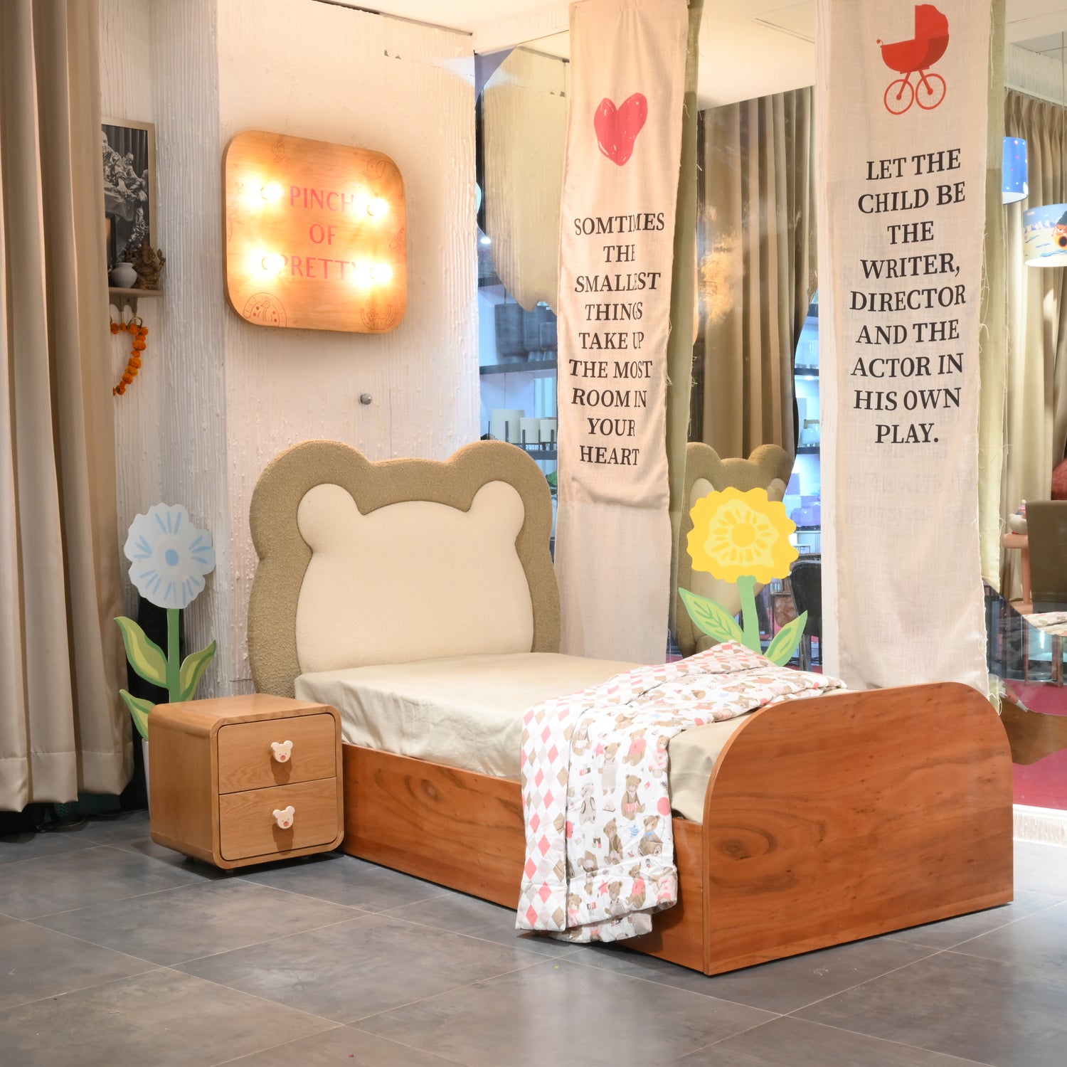 Transform bedtime into cuddle time with our Teddy Bear Headboard Kids’ Bed. The soft, bear-shaped upholstered headboard creates a dreamy, storybook look—perfect for toddlers. Solid wood construction and under-bed storage space keep the design functional and whimsical.